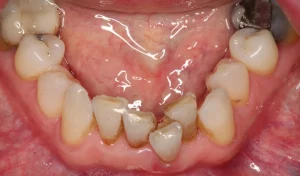 On the left below, this is the start of treatment where hardly any lower teeth are showing. On the right you can see the crooked teeth before the braces went on. The teeth are trapped, which causes them to wear down, chip and break.